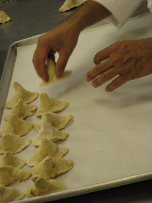 Here the women observe the discussion between Chef Jeff and Roshan about the preparation of singara (or sumosa) wrappers. They discuss the dough consistency. Chef Jeff offers to roll and cut the wrappers or to hand-form them, the traditional way. The two agree on the faster roll method, which the women observe.